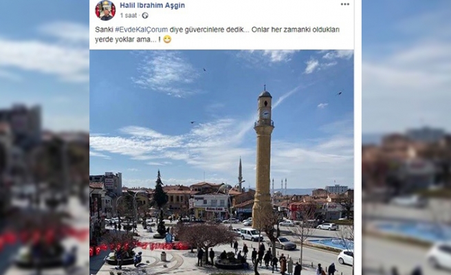 Tüm dünyayı etkisine alan Koronavirüs salgını nedeniyle yapılan evde kal çağrılarına vatandaşlar uymamasına Çorum Belediye Başkanı Dr. Halil İbrahim Aşgın sitem etti. Çorum’da Koronavirüsle mücadele kapsamında “Evde Kal” çağrıları yapılırken güneşli havayı fırsat bilen vatandaşlar kendilerini sokağa attı. Belediye Başkanı Dr. Halil İbrahim Aşgın, sosyal medya hesabından yayınladığı “Sanki #EvdeKalÇorum diye güvercinlere dedik… Onlar her zamanki oldukları yerde yoklar ama.” mesajıyla sitemini dile getirdi.