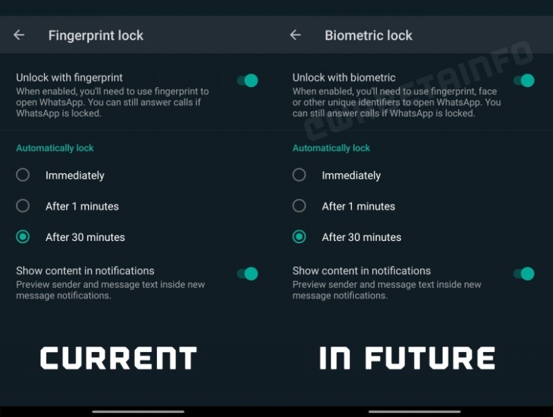 WhatsApp’ın Android sürümü için yeni yüz tanıma özelliği, WhatsApp’ın beta sürümlerini karıştırarak henüz geliştirilen ancak duyurulmamış yenilikleri bulmasıyla ünlenen WABetaInfo sitesi tarafından bulundu. WhatsApp’ın beta sürümlerinde gizlilik sekmesi altındaki “Parmak izi kilidi” özelliği, “Yüz tanıma kilidi” olarak değiştirildi.